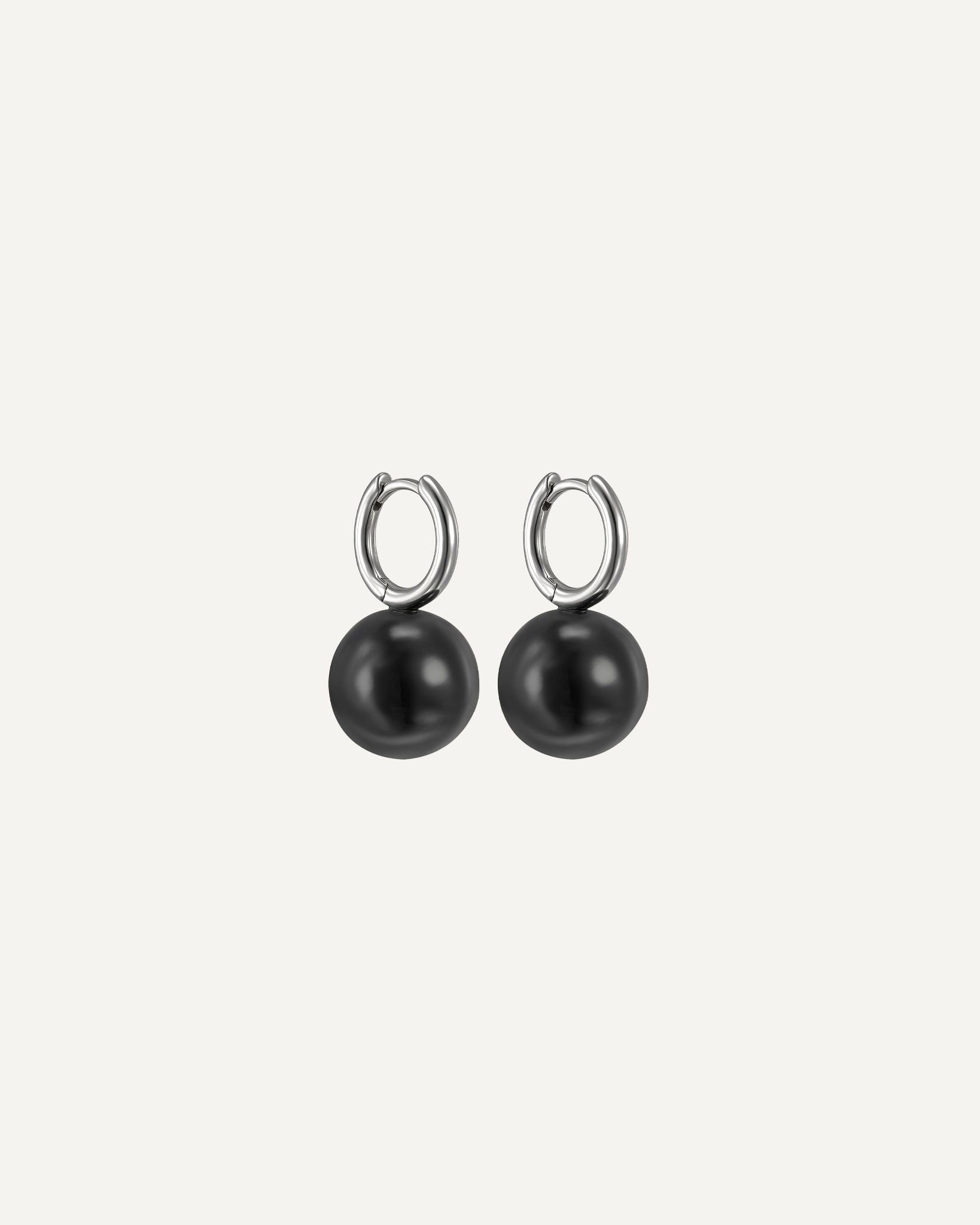 The silver hoops are embellished with sleek onyx; the impeccable shapes—a circle and a sphere ball—are intertwined in a refined balance.