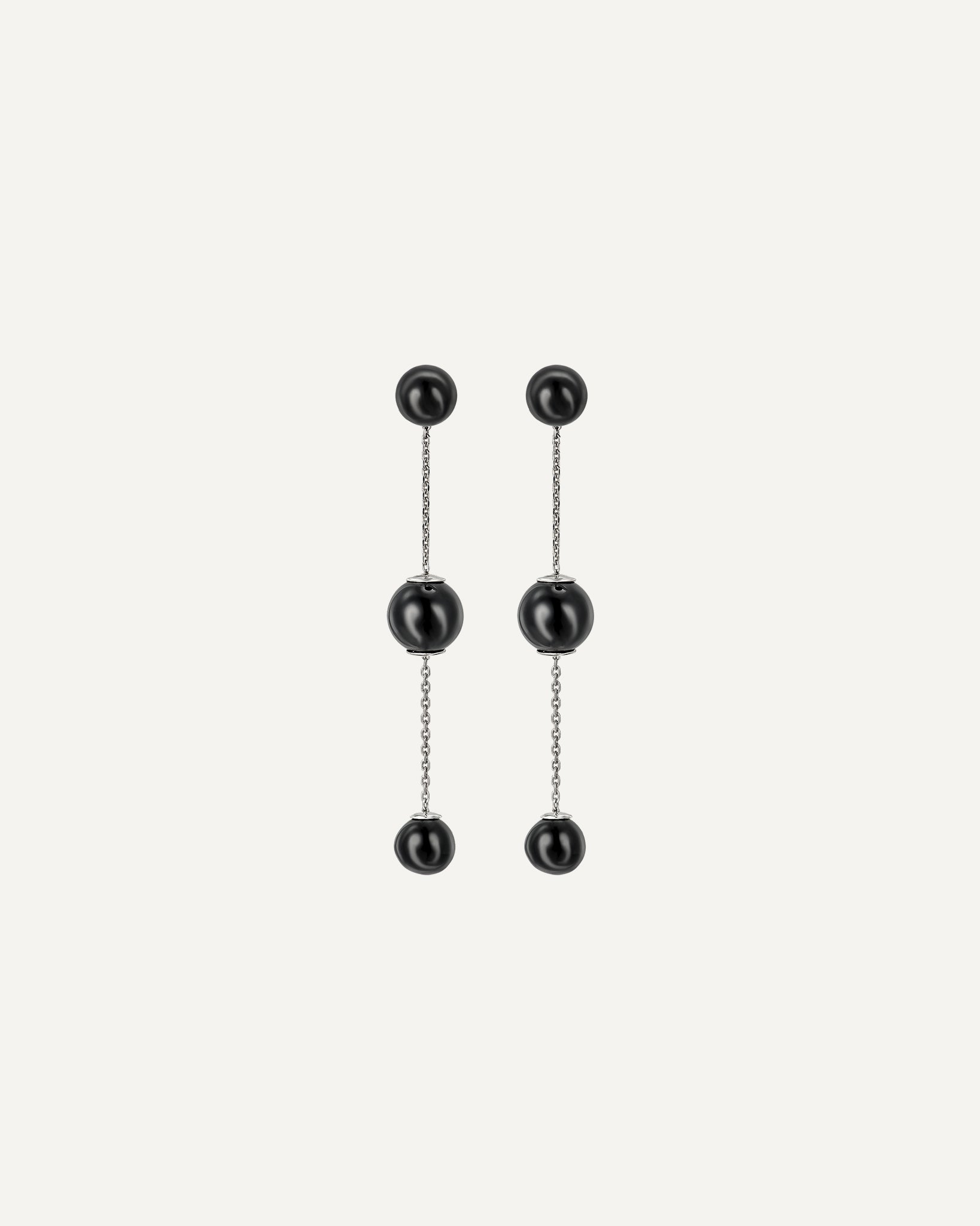 Our dangling earrings are filling the gap between retro and modern. Symbolizing a perfect shape, black onyx sphere balls are rhythmically placed on a delicate silver chain.